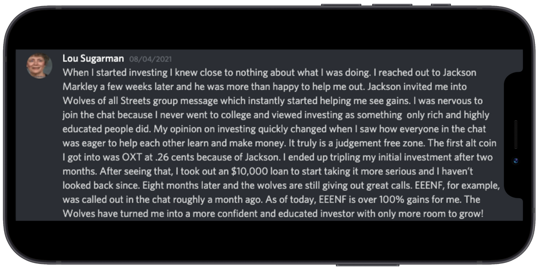 The Wolves of All Streets is a private Discord Community focused on sharing the wealth with others through a diverse group of members. In our community there are professionals in all industries from finance to health care.